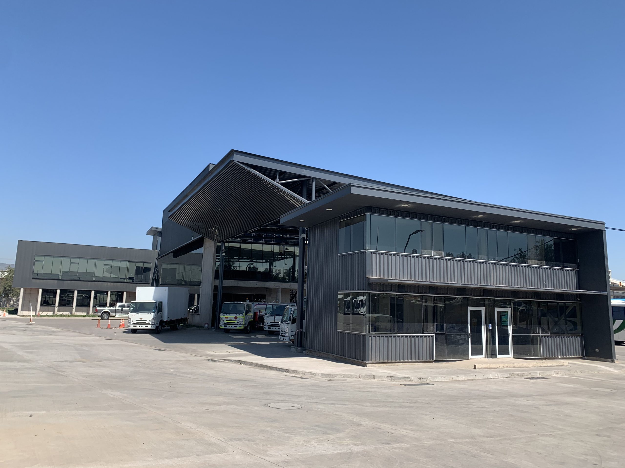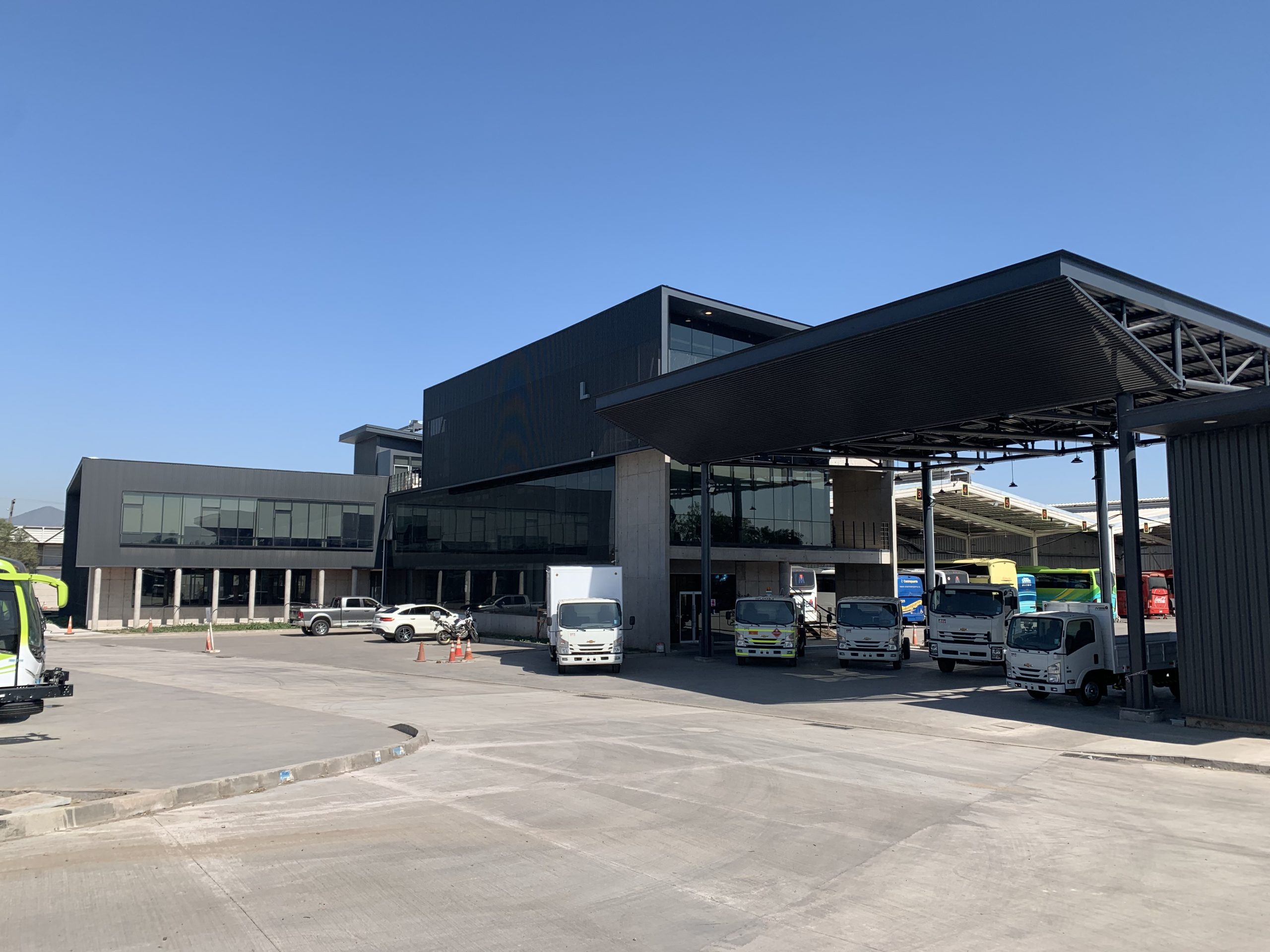 Descripción: Construcción de Edificio de Hormigón Armado de 3 pisos, Construcción de Edificio de Recepción y Sala de espera de Choferes en estructura metálica, tabiques y losa colaborante, Construcción de Camarines y oficinas en Bodega existente, Pavimentos exteriores y 2 casetas de guardia.